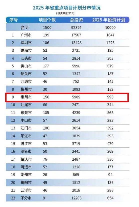 根据计划,惠州共有150个省重点项目,总投资达5909亿元,2025年计划投资990亿元★。