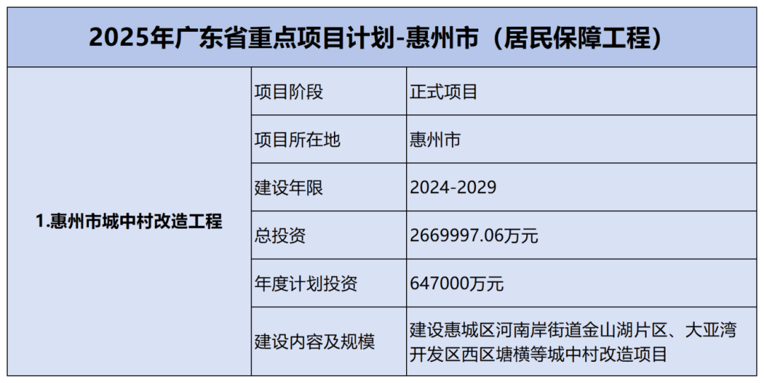在城中村改造方面★,计划总投资266亿元★,本年度计划投资64.7亿元,建设项目包括惠城区河南岸街道金山湖片区、大亚湾开发区西区塘横等城中村改造项目★。