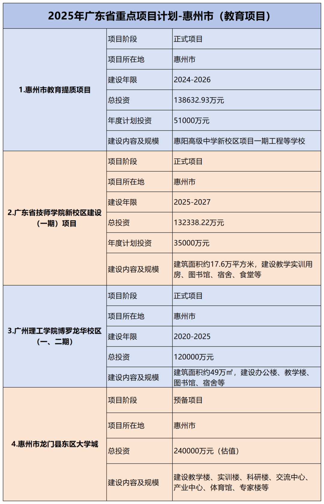 在教育项目方面,惠州市教育提质项目总投资13.86亿元,建设包括惠阳高级中学新校区项目一期工程等学校在内的项目。