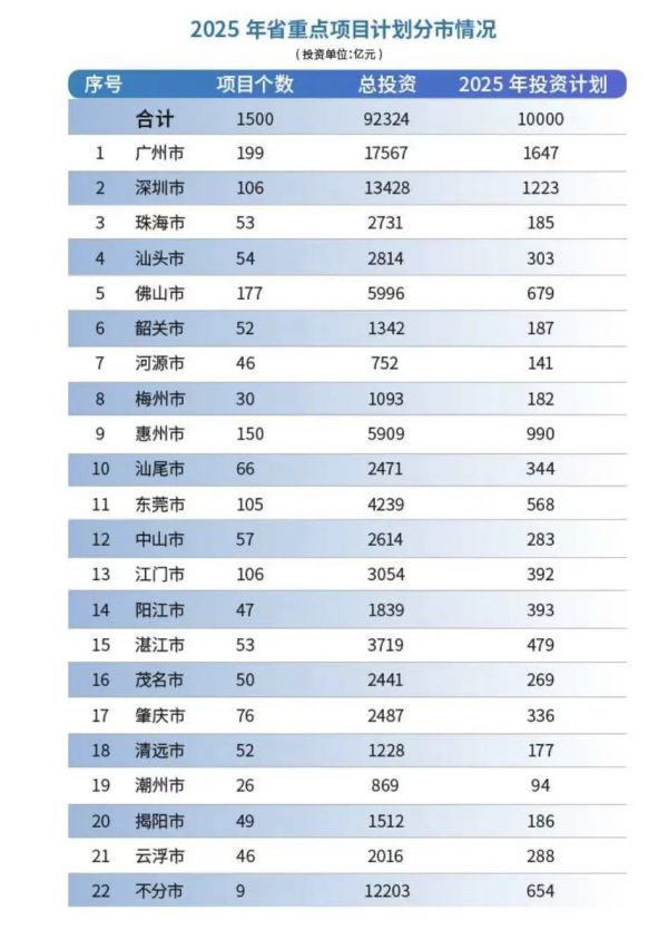 1月15日,广东省十四届人大三次会议盛大开幕★,省政府工作报告随之揭晓2025年省重点建设项目布局★。全省精心规划了1500个重点建设项目,拟定年度投资规模达1万亿元,其中新开工项目215个★,计划建成投产项目218个 。在此之中,佛山表现亮眼★,共有177个项目成功入选省重点项目清单,入选数量仅次于广州,稳稳占据全省第二的位置★,涉及的总投资金额约5996亿元。