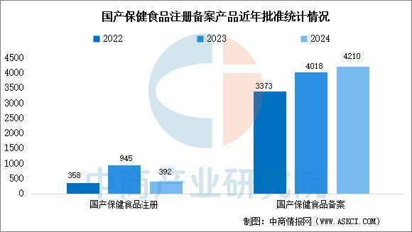 中商产业研究院发布的《2025-2030年中国保健食品行业调查及发展前景分析报告》显示★,截至2024年12月24日,2024年共有392款国产保健食品获得注册证书,共有4210款国产保健食品获得备案凭证。与往年相比,今年备案类的产品有所增加,成为市场新增产品的主要来源。