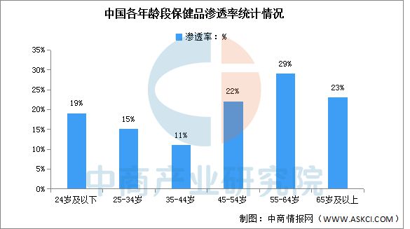 中国保健品渗透率较高的年龄段主要在45岁及以上★,均在20%以上★,24岁及以下年龄段的保健品渗透率为19%★,我国保健品市场发展潜力较大★。