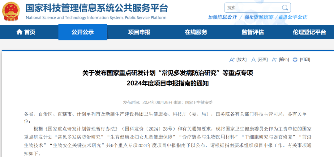 2024年8月,国家科技管理信息系统公共服务平台发布通知,★“干细胞研究与器官修复”被列为2024年度国家重点研发计划的重点专项之一。