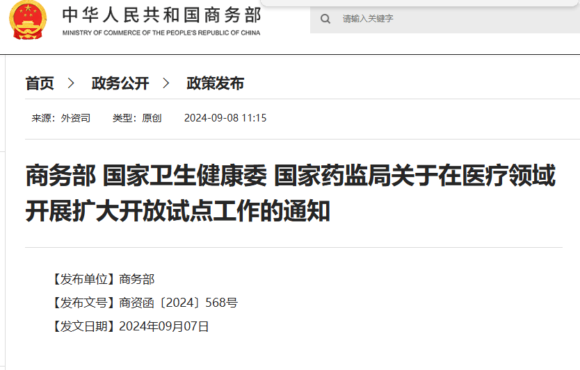 2024年9月7日,商务部★、国家卫生健康委员会与国家药品监督管理局三部门联合发布了《关于在医疗领域开展扩大开放试点工作的通知》。此通知标志着我国在医疗领域的对外开放迈出了重要一步。