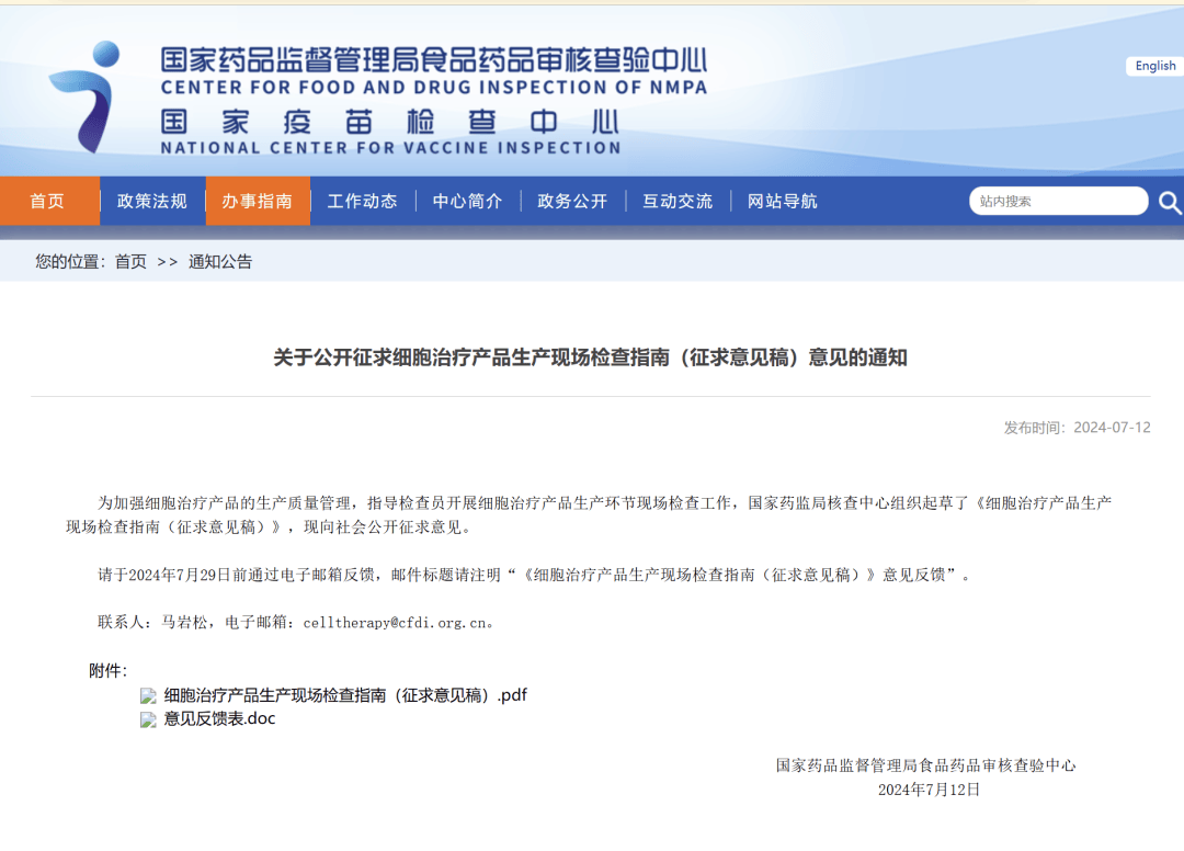 7月12日★,国家药品监督管理局食品药品审核查验中心(CFDI)于官网发布了《细胞治疗产品生产现场检查指南(征求意见稿)》★,旨在强化细胞治疗产品的生产质量管理★,并为检查员提供现场检查指导★。反馈意见需在2024年7月29日前提交。